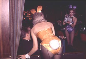 A Bunny keeps a keyholder company while a Bunny shutterbug snaps a photo for a nickel. Playboy, March 1962